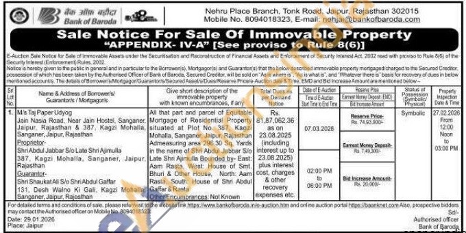 All that part and parcel of Equitable Mortgage of Residential Property situated at Plot No. 387, Kagzi Mohalla, Sanganer, Jaipur, Rajasthan Admeasuring area 296.30 Sq. Yards in the name of Shri Abdul Jabbar Sio Aam Rasta, West House of Smt Bhuri & Other House, North Aam Rasta, South House of Shri Abdul Late Shri Ajimulla Bounded by- East: Gaffar & Rasta