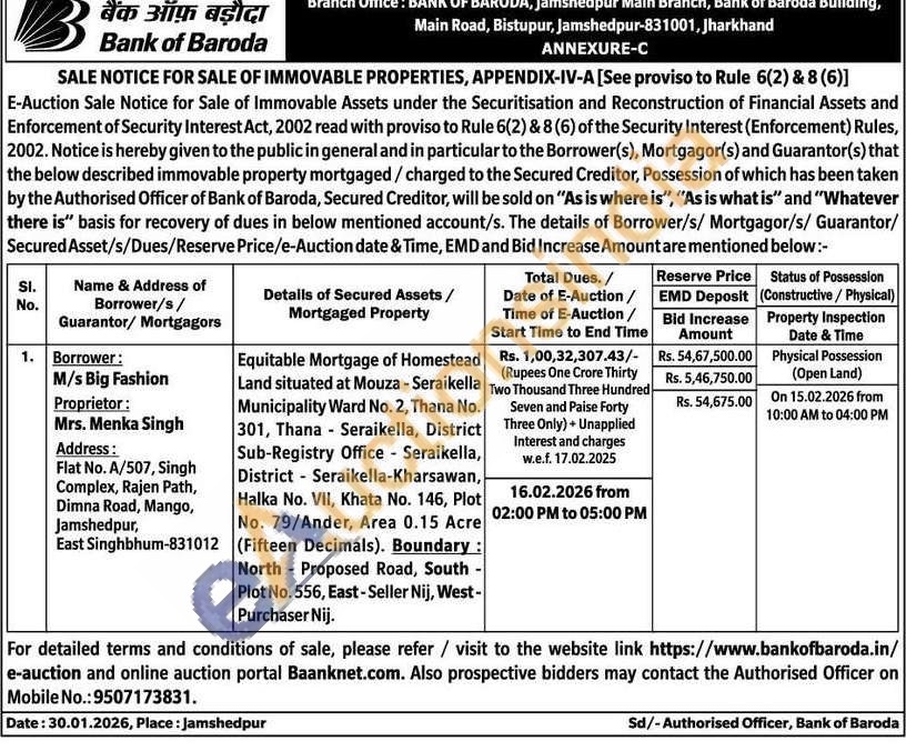 Equitable Mortgage of Homestead Land situated at Mouza - Seraikella Municipality Ward No. 2, Thana No. 301, Thana Seraikella, District Sub-Registry Office - Seraikella, District - Seraikella-Kharsawan, Halka No. VII, Khata No. 146, Plot No. 79/Ander, Area 0.15 Acre (Fifteen Decimals). Boundary: North Proposed Road, South -Plot No. 556, East-Seller Nij, West-Purchaser Nij.