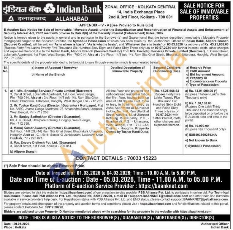All that Piece and parcel of one self-contained residential flat on the first floor, having built up area of 618 Square Feet, more or less, in building named as Asha Apartment at Municipal Holding No. 14/4, Ram Sita Ghat Street, Ward No. 13, of Uttarpara Kotrung Municipality, P.O. Bhadrakali, P.S. Uttarpara, West Bengal, Pin-712 232, District Hooghly. Property Owned by Tushar Kanti Dutta