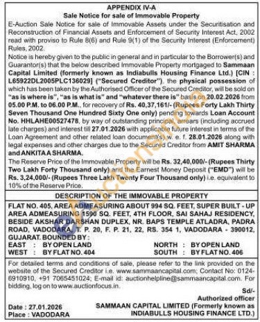 FLAT NO. 405, AREA ADMEASURING ABOUT 994 SQ. FEET, SUPER BUILT-UP AREA ADMEASURING 1590 SQ. FEET, 4TH FLOOR, SAI SAHAJ RESIDENCY, BESIDE AKSHAR DARSHAN DUPLEX, NR. BAPS TEMPLE ATLADRA, PADRA ROAD, VADODARA, T. P. 20, F. P. 21, 22, RS. 354 1, VADODARA GUJARAT. BOUNDED BY: