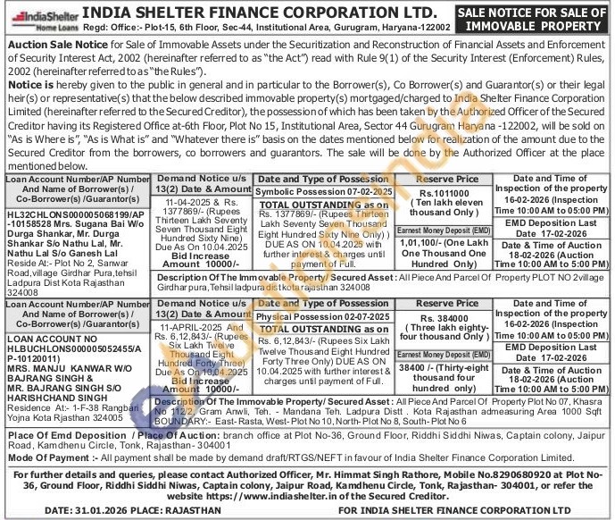 Description Of The Immovable Property/Secured Asset: All Piece And Parcel Of Property Plot No 07, Khasra No 112/2, Gram Anwli, Teh. Mandana Teh. Ladpura Distt. Kota Rajasthan admeasuring Area 1000 Sqft BOUNDARY:- East-Rasta, West-Plot No 10, North-Plot No 8, South-Plot No 6