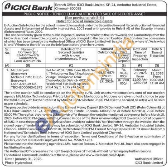 Flat No.4104, 10th Floor Block No. 4. "Tvhouranya Bay "Kazhipatur Village, Thiruporur Taluk, Chengalpattu District-603103 Residential Flat Built-up area 2084 Sq.ft., UDS 744 Sq.ft