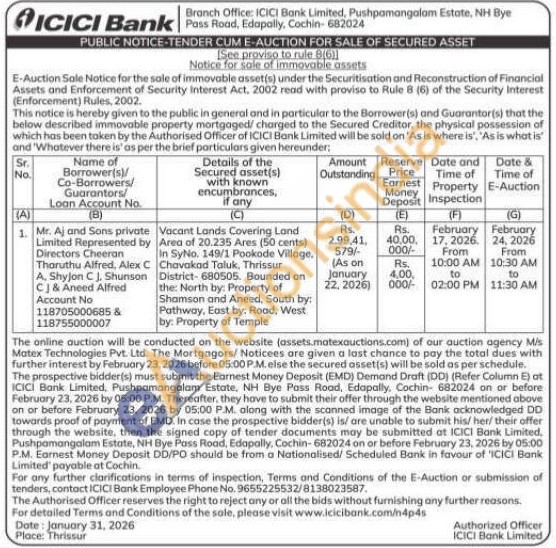 Vacant Lands Covering Land Area of 20.235 Ares (50 cents) In SyNo. 149/1 Pookode Village, Chavakad Taluk, Thrissur District-680505. Bounded on the: North by: Property of Shamson and Aneed, South by: Pathway, East by: Road, West by: Property of Temple