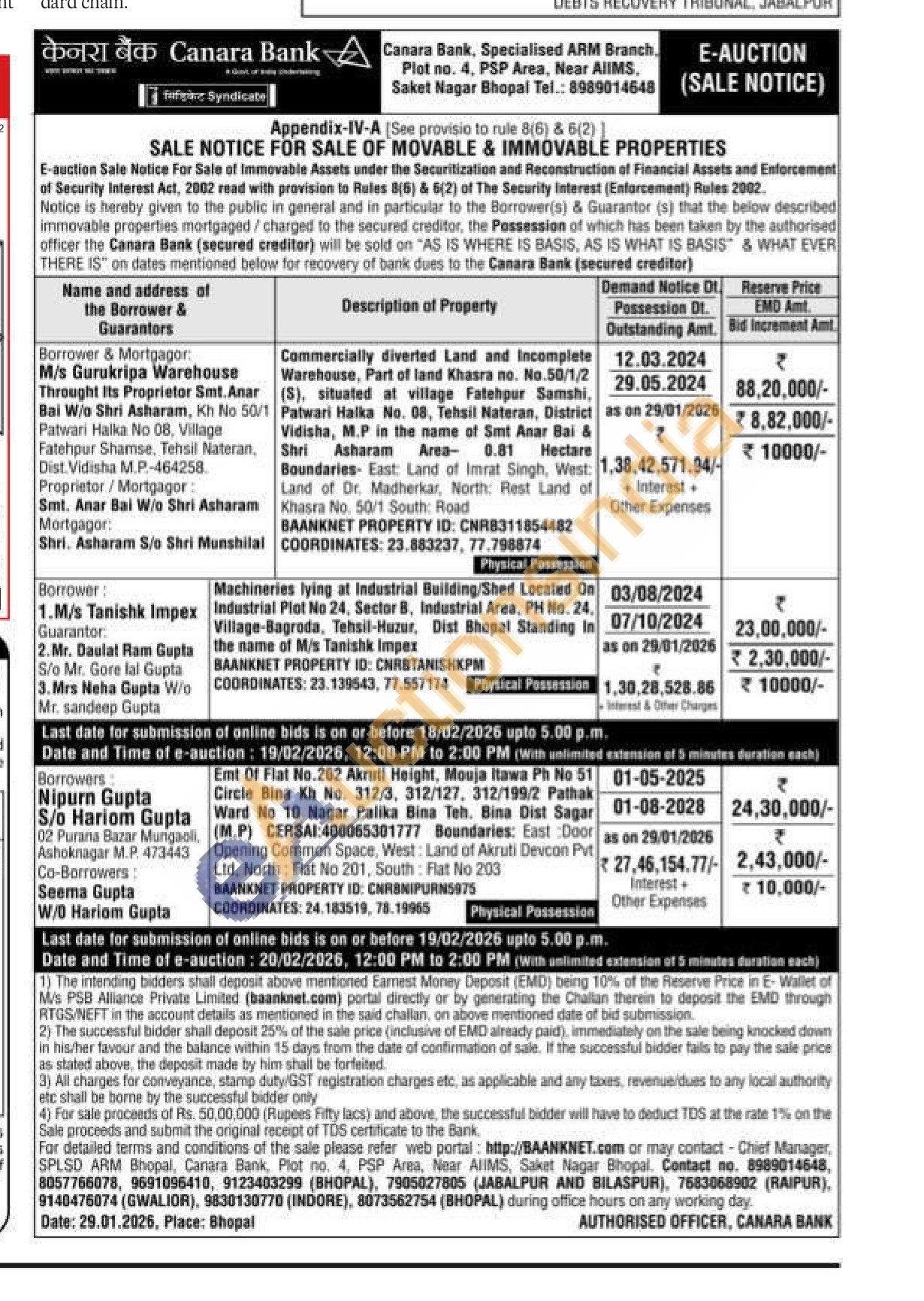 Commercially diverted Land and Incomplete Warehouse, Part of land Khasra no. No.50/1/2 (S), situated at village Fatehpur Samshi, Patwari Halka No. 08, Tehsil Nateran, District Vidisha, M.P in the name of Smt Anar Bai & Shri Asharam Area- 0.81 Hectare Boundaries East: Land of Imrat Singh, West: Land of Dr. Madherkar, North: Rest Land of Khasra No. 50/1 South: Road