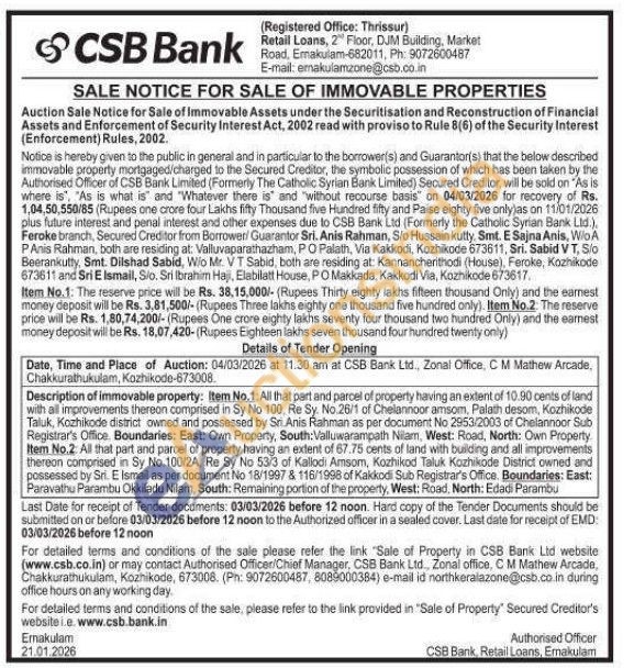Item No.2: All that part and parcel of property having an extent of 67.75 cents of land with building and all improvements thereon comprised in Sy No. 100/2A, Re Sy No 53/3 of Kaliodi Amsom, Kozhikod Taluk Kozhikode District owned and possessed by Sri. E Ismail as per document No 18/1997 & 116/1998 of Kakkodi Sub Registrar's Office Boundaries: East: Paravathu Parambu Okkiladu Nilam, South: Remaining portion of the property, West: Road, North: Edadi Parambu