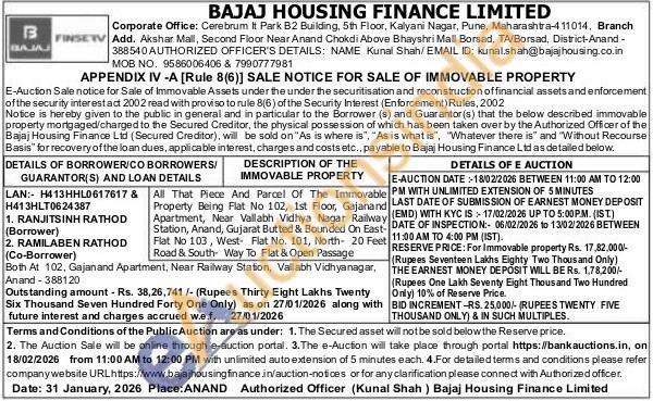 All That Piece And Parcel Of The Immovable Property Being Flat No 102, 1st Floor, Gajanand Apartment, Near Vallabh Vidhya Nagar Railway Station, Anand, Gujarat Butted & Bounded On East-Flat No 103, West Flat No. 101, North 20 Feet Road & South- Way To Flat & Open Passage