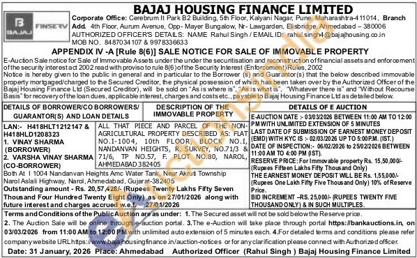 ALL THAT PIECE AND PARCEL OF THE NON AGRICULTURAL PROPERTY DESCRIBED AS: FLAT NO.1-1004, 10th FLOOR, BLOCK NO.1, NANDANVAN HEIGHTS, R. SURVEY, NO.71/3 & 71/6, ΤΡ ΝΟ.57, F. PLOT NO.80, NAROL, AHMEDABAD 382405