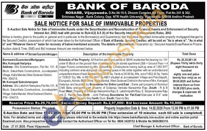 Schedule of the Property: All that the piece and parcel of 2BHK residential flat bearing no: 101 under B Block on the ground floor of residential multi storied apartment (Stilt + Ground Floor +4 Upper Floors) constructed by M/s. Sakunthala Constructions having built-up area of 1250 SFT including common area along with car parking space in the cellar together with an undivided and unspecified share of land admeasuring 32.25 Sq. Yards or 26.96 Sq. Mts. out of 1602.43 Sq. Yards or 1339.81 Sq. Mts. in RS No: 491/1 & 488/1 situated at Juvvalapalem Village and Panchayath, Elurupadu, Akividu SRO Limits, Kalla Mandal, West Godavani District in the name of Mrs. Korrapati Haripriya and bounded by Boundaries for Entire Land:East: Some part property of Kommuri Chitti Babu and some part property of Gokaraju Venkata Narasimha Raju, South: R & B Road, West: Property of Gokaraju Narasimha Raju, E. Lakshmipathi Raju, E. Satyanarayana Raju and E. Ranga Raju North Joint Pathway, Boundaries for Flat East:Staircase & 6-6" wide corridor, West: Open to Sky, North: Duct, South: Open to Sky