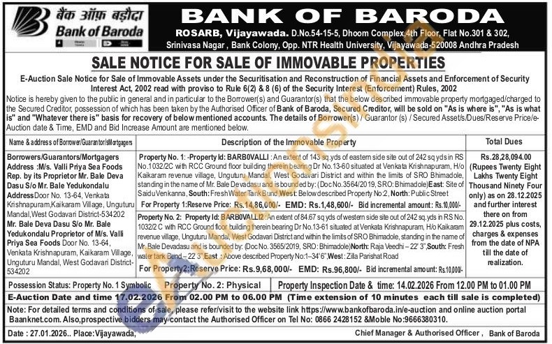 Property No. 2: Property Id: BARBOVALLI2: An extent of 84.67 sq yds of western side site out of 242 sq. yds in RS No. 1032/2 C with RCC Ground floor building therein bearing Dr No.13-61 situated at Venkata Krishnapuram, Hio Kaikaram revenue village, Unguturu Mandal, West Godavari District and within the limits of SRO Bhimadole, standing in the name of Mr. Bale Devadasu and is bounded by, (Doc No. 3565/2019, SRO: Bhimadole) North: Raja Veedhi-22 3", South: Fresh water tank Bund-22 3", East: Above described Property No:1-34'6" West: Zila Parishat Road