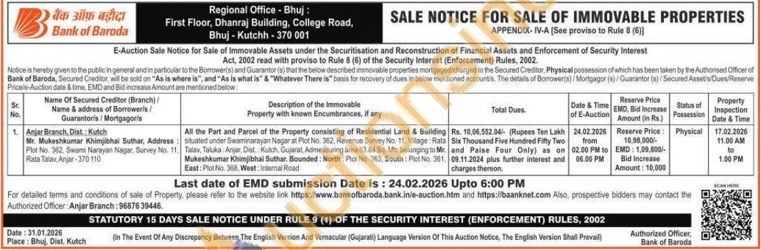 All the Part and Parcel of the Property consisting of Residential Land & Building situated under Swaminarayan Nagar at Plot No. 362. Revenue Survey No. 11, Vilage Rata Talav, Taluka Anjar, Dist. Kutch, Gujarat, Admeasuring area 83.84 Sq. Mr, belonging to Mr. Mukeshkumar Khimjibhai Suthar. Bounded: North: Plot No. 363, South: Plot No. 361. East: Plot No. 368. West: Intemal Road