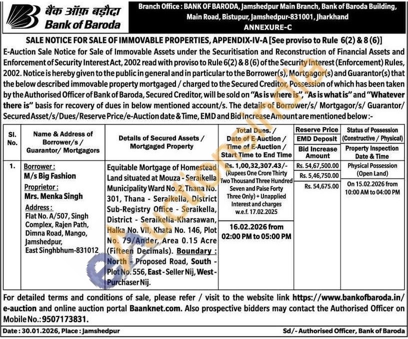 Equitable Mortgage of Homestead Land situated at Mouza - Seraikella Municipality Ward No. 2, Thana No. 301, Thana Seraikella, District Sub-Registry Office Seraikella, District Seraikella-Kharsawan, Halka No. VII, Khata No. 146, Plot No. 79/Ander, Area 0.15 Acre (Fifteen Decimals). Boundary: North - Proposed Road, South Plot No. 556, East-Seller Nij, West-Purchaser Nij