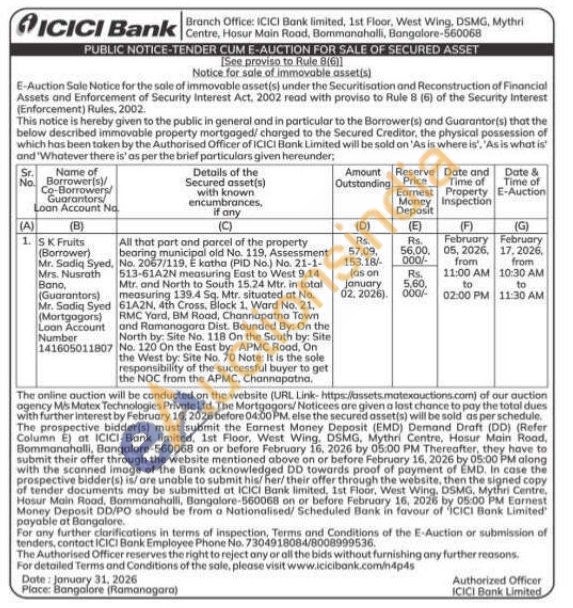 All that part and parcel of the property bearing municipal old No. 119, Assessment No. 2067/119, E katha (PID No.) No. 21-1-513-61A2N measuring East to West 9.14 Mtr. and North to South 15.24 Mtr. in total measuring 139.4 Sq. Mtr. situated at No. 61A2N, 4th Cross, Block 1, Ward No. 21, RMC Yard, BM Road, Channapatna Town and Ramanagara Dist. Bounded By: On the North by Site No. 118 On the South by: Site No. 120 On the East by: APMC Road, On the West by: Site No. 70 Note: It is the sole responsibility of the successful buyer to get the NOC from the APMC, Channapatna