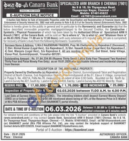DESCRIPTION OF THE IMMOVABLE PROPERTY: Property Owned by Chellamuthu (a) Rajendran.in Tiruvallur District, Gummidipoondi Taluk and Registration District of North Chennai, Sub Registration District of Gummidipoondi at No.51, Elavur II Village, comprised in Punjai S. No. 432/1A, Patta No.78, measuring to an extent of Acre 0.30 Cents. Bounded on the North by: Land in Survey No. 427, South by: Land in Survey No. 433. East by: Land in Survey No. 432/18, West By: Road