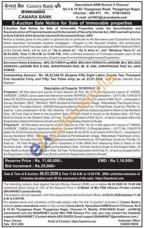 Property-l: All that piece and parcel of land derived as Piot. No 11 in the approved Layout of "ANGEL GARDEN, CMDA Layout approval reference number REPPDILO (Regularisation-2017) No. 1354/2019 dated 30.05.2019 and planning permi No.12504 dated 30.05.2018, to an extent of 840 Sq. Ft.. comprised in Survey Numbers 166/3, 166/4and 166/5 situated at Pandeswaram village, Villavakkam Panchayat Union, Avadi Taluk, Tiruvallur District-600055 being bounded on the North by: 18 Feet Road, South by: Plot No. 12. East by: Land comprised in 8.No. 165, West by: 18 Feet Road And measuring East to West on the Northern Side: 39 Feet. East to West on the Southam Side: 45 Feet, North to South on the Eastem Side: 20 Feet. North to South on the Western Side: 20 Feet. To the total extent of 840 Sq.Ft., of land is situated within the Registration District of Cherinai (South) and Sub-Registration District of Avadi