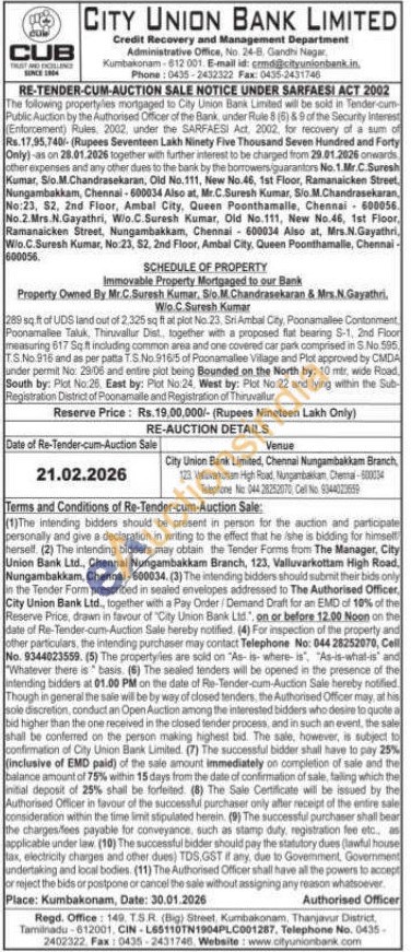 Immovable Property Mortgaged to our Bank : Property Owned By Mr.C.Suresh Kumar, Sio.M.Chandrasekaran & Mrs.N.Gayathri. W/o.C.Suresh Kumar 289 sq.ft of UDS land out of 2,325 sq ft at plot No.23, Sri Ambal City, Poonamallee Contonment Poonamaliee Taluk, Thiruvallur Dist., together with a proposed flat bearing S-1, 2nd Floor measuring 617 Sq.ft including common area and one covered car park comprised in S.No.595. T.S.No.916 and as per patta T.S.No.916/5 of Poonamallee Village and Plot approved by CMDA under permit No: 29/06 and entire plot being Bounded on the North by: 10 mtr, wide Road South by: Plot No:26. East by: Plot No:24, West by: Plot No:22 and lying within the Sub-Registration District of Poonamalle and Registration of Thiruvallur