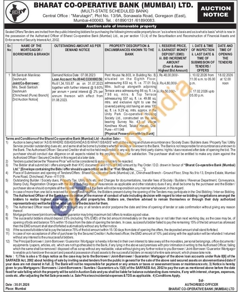 Pent House No.803, in Building No. B situated on the Eighth Floor, admeasuring 833 sq. ft. i.e. 77.01 Sq.. Mtrs. built-up alongwith adjoining Terrace area admeasuring 86 sq. ft.i.e 7.98 sq. mtrs. & Top Terrace admeasuring 537 sq. ft. i.e. 49.88 sq. mirs. and exclusive right to use the covered parking slot having an area 100 sq. ft. i.e. 9.29 sq. mtrs. approx. in the Unity Park Co-operative Housing Society Ltd., constructed on the land bearing Survey No. 43 of village Kondhwa Khurd, Taluka Haveli, Dist. Pune-411048