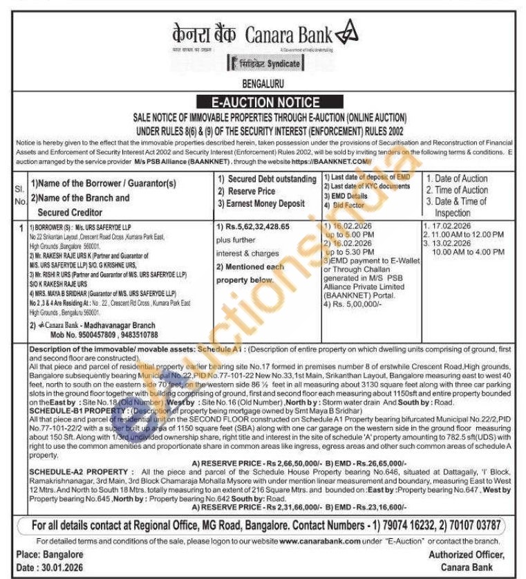 Description of the immovable/ movable assets: Schedule A1: (Description of entire property on which dwelling units comprising of ground, first and second floor are constructed). All that piece and parcel of residential property earlier bearing site No.17 formed in premises number 8 of erstwhile Crescent Road, High grounds, Bangalore subsequently bearing Municipal No.22, PID No.77-101-22 New No.33, 1st Main, Srikanthan Layout, Bangalore measuring east to west 40 feet, north to south on the eastern side 70 feet, on the western side 86% feet in all measuring about 3130 square feet along with three car parking slots in the ground floor together with building comprising of ground, first and second floor each measuring about 1150sft and entire property bounded on the East by: Site No. 18 (Old Number), West by: Site No. 16 (Old Number), North by: Storm water drain And South by: Road. SCHEDULE-B1 PROPERTY: (Description of property being mortgage owned by Smt Maya B Sridhar) All that piece and parcel of residential unit on the SECOND FLOOR constructed on Schedule A1 Property bearing bifurcated Municipal No 22/2, PID No.77-101-22/2 with a super built up area of 1150 square feet (SBA) along with one car garage on the western side in the ground floor measuring about 150 Sft. Along with 1/3rd undivided ownership share, right title and interest in the site of schedule 'A' property amounting to 782.5 sft(UDS) with right to use the common amenities and proportionate share in common areas like ingress, egress areas and other such common areas of schedule A property.