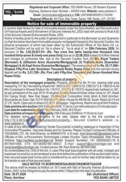 Description of the mortgaged property: Property- House Pvt No 70 min, bearing total area measuring 131 Sq Yds bearing khasra No 1363//(2-15), 1364/(0-5),1365/(0-7) & 1366/(0-4) A Min Comprised in Khewat Khatoni No 176/372, 177/373 & 178/372 respectively hadbast no 387, as per jamabandi of the year 2015-16 situated at Vakia Rarka Amritsar Urban circle no 107, Abadi Kot Ganga Singh, New Rop Nagar, I/S Municipal Corporation limits tehsil & Distt Amritsar. Boundaries as: East: Gali 15.0 F1 Wd//45.0 FL, West: House No 69/148,06, South: Rasta 30.0% wd 27.0ft, North: Open plot of others//23.06 Ft. Mortgagor: Kapil Arora, Rashmi Arora & Smt Pratibha