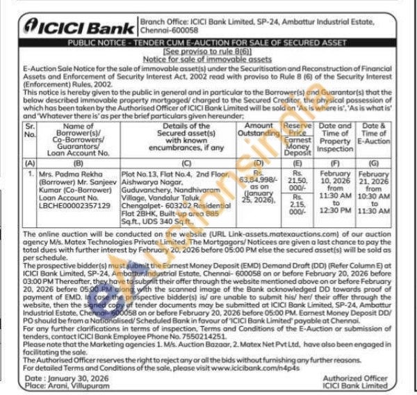 Plot No. 13, Flat No.4, 2nd Floor, Aishwarya Nagar, Guduvanchery, Nandhivaram Village, Vandalur Taluk, Chengalpet-603202 Residential Flat 28HK, Built-up area 885 Sq.ft., UDS 340 Sq.ft.