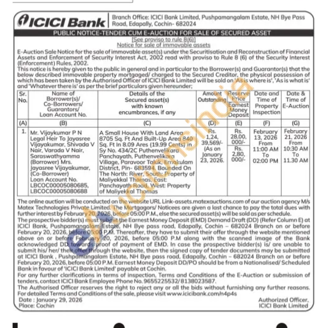 A Small House With Land Area 8705 Sq. Ft And Built-Up Area 840 Sq. Ft In 8.09 Ares (19.99 Cents) in Sy No. 434/2C Puthenvelikara Panchayath, Puthenvelikara Village. Paravoor Taluk, Ernakulam District, Pin- 683594. Bounded On The North: River, South: Property of Maliyekkal Thomas, East Panchayath Road, West: Property of Maliyekkal Thomas