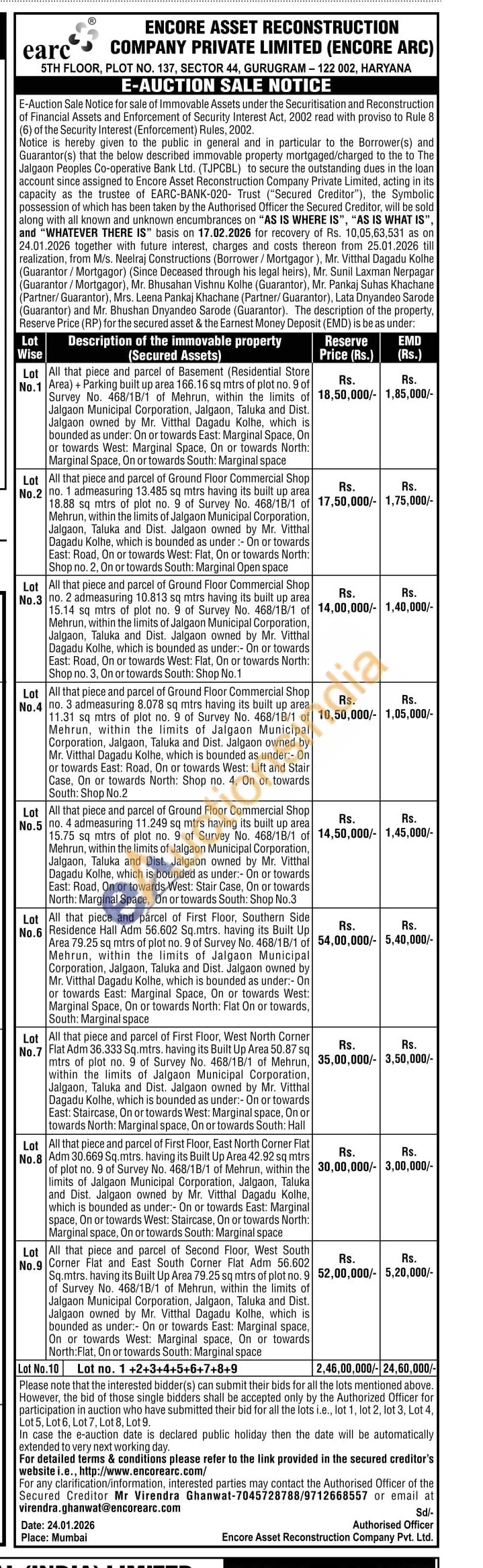 All that piece and parcel of First Floor, East North Corner Flat Adm 30.669 Sq.mtrs. having its Built Up Area 42.92 sq mtrs of plot no. 9 of Survey No. 468/18/1 of Mehrun, within the limits of Jalgaon Municipal Corporation, Jalgaon, Taluka and Dist. Jalgaon owned by Mr. Vitthal Dagadu Kolhe, which is bounded as under: On or towards East: Marginal space, On or towards West: Staircase, On or towards North: Marginal space, On or towards South: Marginal space
