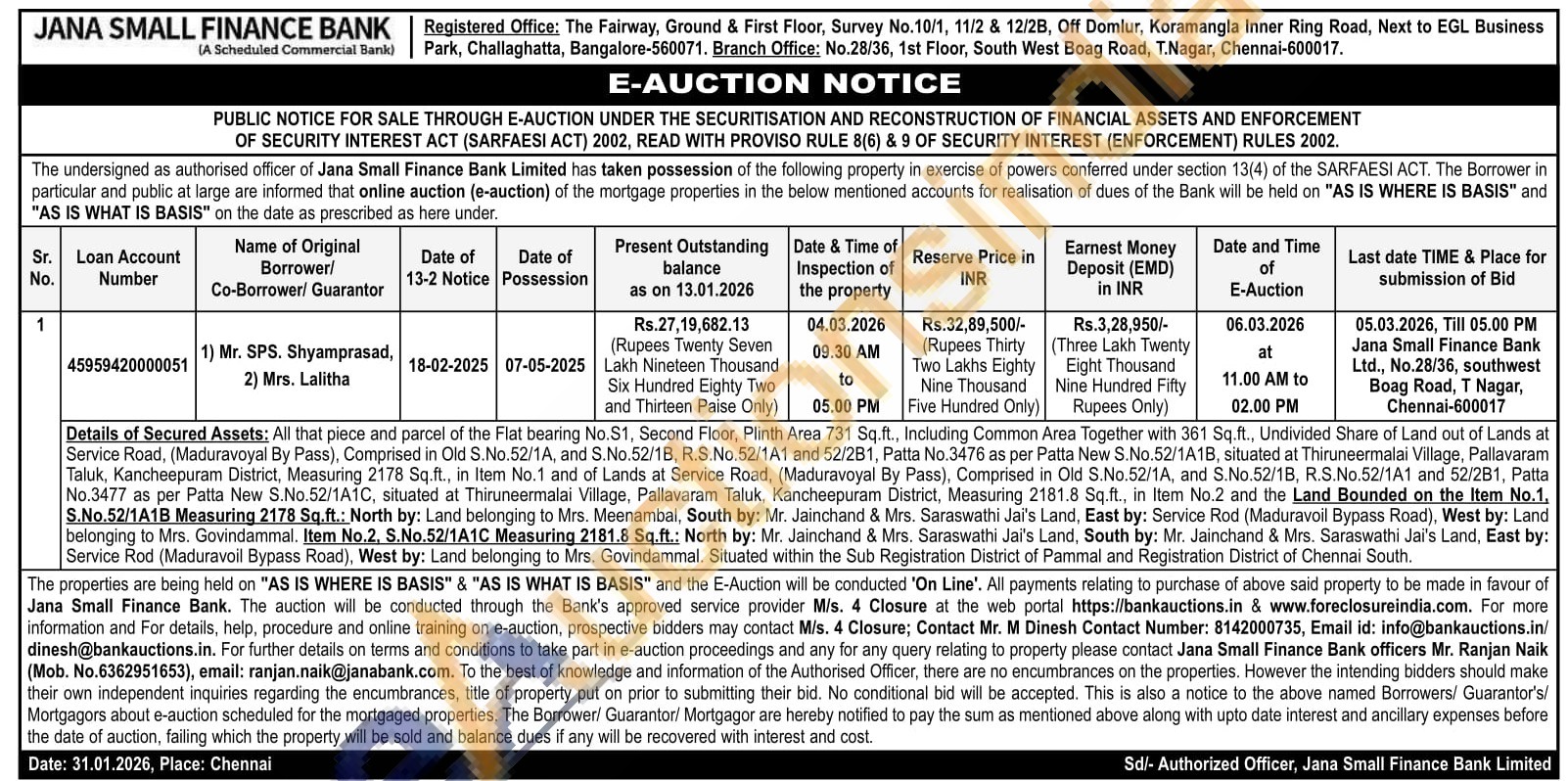 Details of Secured Assets: All that piece and parcel of the Flat bearing No.S1, Second Floor, Plinth Area 731 Sq.ft., Including Common Area Together with 361 Sq.ft., Undivided Share of Land out of Lands at Service Road, (Maduravoyal By Pass), Comprised in Old S.No.52/1A, and S.No.52/1B, R.S.No.52/1A1 and 52/281, Patta No.3476 as per Patta New S.No.52/1A1B, situated at Thiruneermalai Village, Pallavaram Taluk, Kancheepuram District, Measuring 2178 Sq.ft., in Item No.1 and of Lands at Service Road, (Maduravoyal By Pass), Comprised in Old S.No.52/1A, and S.No.52/1B, R.S.No.52/1A1 and 52/2B1, Patta No.3477 as per Patta New S.No.52/1A1C, situated at Thiruneermalai Village, Pallavaram Taluk, Kancheepuram District, Measuring 2181.8 Sq.ft., in Item No.2 and the Land Bounded on the Item No.1, S.No.52/1A1B Measuring 2178 Sq.ft.: North by: Land belonging to Mrs. Meenambal, South by: Mr. Jainchand & Mrs. Saraswathi Jai's Land, East by: Service Rod (Maduravoil Bypass Road), West by: Land belonging to Mrs. Govindammal. Item No.2, S.No.52/1A1C Measuring 2181.8 Sq.ft.: North by: Mr. Jainchand & Mrs. Saraswathi Jai's Land, South by: Mr. Jainchand & Mrs. Saraswathi Jai's Land, East by: Service Rod (Maduravoil Bypass Road), West by: Land belonging to Mrs. Govindammal. Situated within the Sub Registration District of Pammal and Registration District of Chennai South.