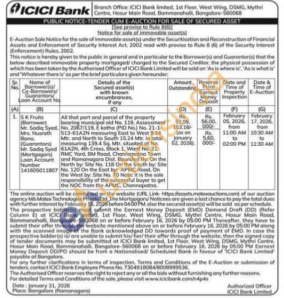 All that part and parcel of the property bearing municipal old No. 119, Assessment No. 2067/119, E katha (PID No.) No. 21-1-513-61A2N measuring East to West 9.14 Mtr. and North to South 15.24 Mtr. in total measuring 139.4 Sq. Mtr. situated at No. 61A2N, 4th Cross, Block 1, Ward No. 21, RMC Yard, BIM Road, Channapatno Town and Ramanagara Dist. Bounded By: On the North by: Site No. 118 On the South by: Site No. 120 On the East by: APMC Road, On the West by: Site No. 70 Note: It is the sole responsibility of the successful buyer to get the NOC from the APMC, Channapatna.