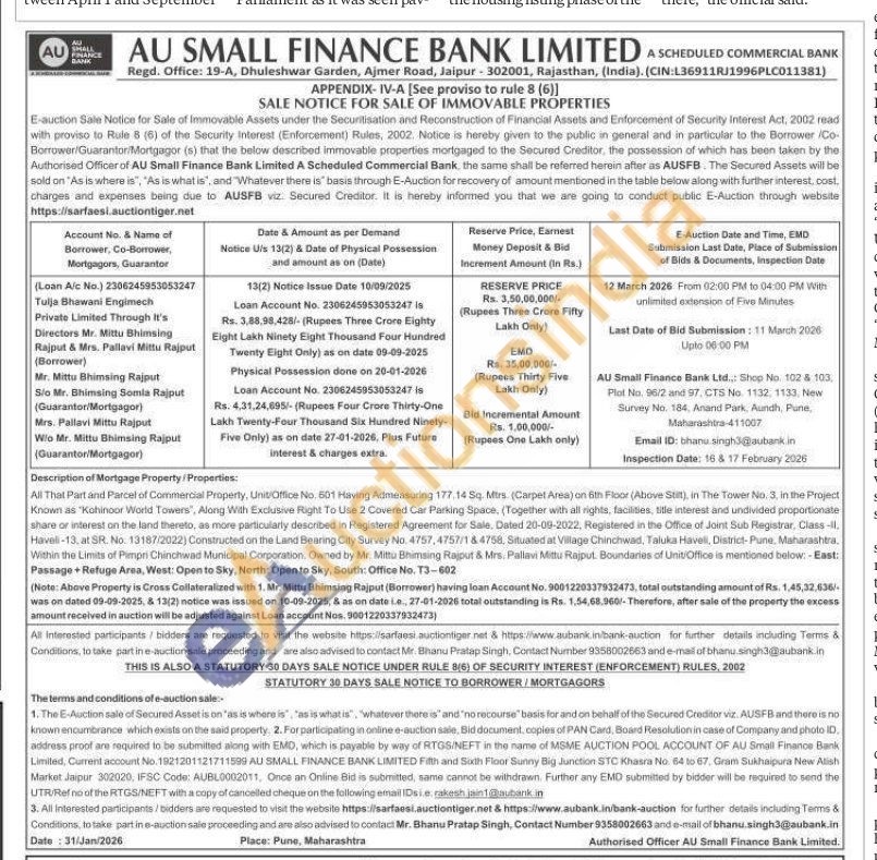 All That Part and Parcel of Commercial Property, Unit Office No. 501 Having Admeasuring 177.14 Sq. Mitrs. (Carpet Area) on fith Floor (Above Stilt), in The Tower No. 3, In the Project Known as "Kohinoor World Towers", Along With Exclusive Right To Use 2 Covered Car Parking Space, (Together with all rights, facilities, title interest and undivided proportionate share or interest on the land thereto, as more particularly described in Registered Agreement for Sale. Dated 20-09-2022, Registered in the Office of Joint Sub Flegistrar, Class-II. Haveli-13. at SR. No. 13187/2022) Constructed on the Land Bearing City Survey No. 4757, 4757/1 & 4758, Situated at Village Chinchwad, Taluka Havell, District-Pune, Maharashtra, Within the Limits of Pimpri Chinchwad Municipal Corporation, Owned by Mr. Mittu Bhimsing Rajput & Mrs. Pallavi Mittu Rajput Boundaries of Unit/Office is mentioned below: East: Passage + Refuge Area, West: Open to Siky, North: Open to Sky, South: Office No. 13-602