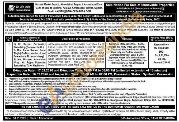 All the piece and parcel of immovable Description: EM of Flat No. C-204, 2nd Floor, Vrundavan Skyline, Nr. Sahitya Residency. Bih Reliance Petrol Pump, Vastral, Ahmedabad, Gujarat -382418 belonging to Mr. Rajput Puransinh Samartsinh and Mrs. Paras Kanwar Puran Singh (Security for the HL) Boundaries:- North-Building Common Wall, South Flat C-203, East - Common Passage and Stairs, West-Fiat B-201