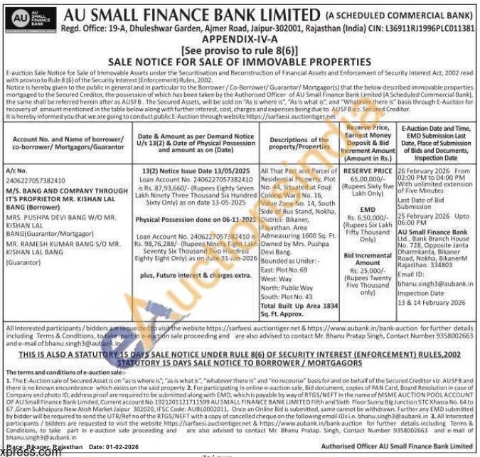 All That Part and Parcel of Residential Property, Plot No. 44, Situated at Fouji Colony, Ward No. 16 Value Zone No. 14, South Side of Bus Stand, Nokha, District-Bikaner, Rajasthan. Area Admeasuring 1600 Sq. Ft. Owned by Mrs. Pushpa Devi Bang