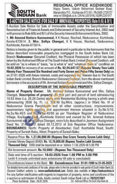All that part and parcel of land admeasuring 10.63 Ares (i.e. 26.26 Cents) along with Residential Building having a plinth area admeasuring 3836 Sq. Ft. i.e. 356.40 Sq.Mtrs. (approx.) in Ward No. VI of Naduvannur Grama Panchayath and all other constructions, improvements, easementary rights existing and appurtenant thereon situated in Sy.No.5/10, Re.Sy.No. 40/5 and Re.Sy.No.40/60 as per Thandaper Register of Naduvannur Village, Koyilandy Taluk, Kozhikode District and owned by Mr. Ammad Kottara Kunnummal and Mrs. Safiya Chengot, more fully described in Jenmam Assignment Deed No. 3145/2012 dated 28.12.2012 of Sub Registrar Office Naduvannur. BOUNDARIES: North: Property of Aboobacker, East: Koottalida Road, South: Property of Suresh Babu, West: Property of Suresh Babu