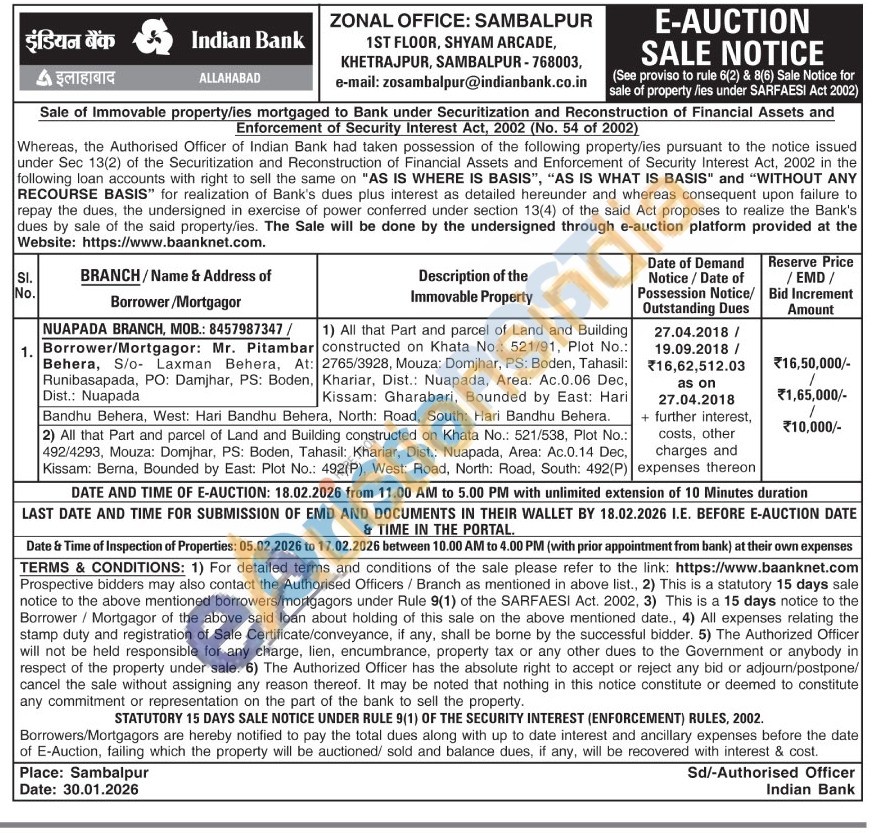 1) All that Part and parcel of Land and Building constructed on Khata No.: 521/91, Plot No.: 2765/3928, Mouza: Domjhar, PS: Boden, Tahasil: Khariar, Dist.: Nuapada, Area: Ac.0.06 Dec, Kissam: Gharabari, Bounded by East: Hari Bandhu Behera, West: Hari Bandhu Behera, North: Road, South: Hari Bandhu Behera. 2) All that Part and parcel of Land and Building constructed on Khata No.: 521/538, Plot No.: 492/4293, Mouza: Domjhar, PS: Boden, Tahasil: Khariar, Dist.: Nuapada, Area: Ac.0.14 Dec, Kissam: Berna, Bounded by East: Plot No.: 492(P), West: Road, North: Road, South: 492(P)