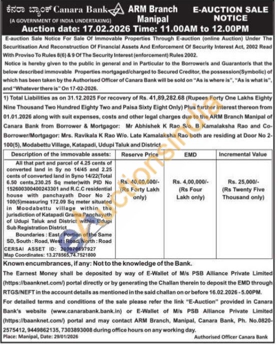 All that part and parcel of 4.25 cents of converted land in Sy no 14/45 and 2.25 cents of converted land in Syno 14/22(Total 6.50 cents,230.25 Sq meter)with PID No 152600300400243301 and R.C.C residential house with panchayath Door No 2-100(5)measuring 172.09 Sq meter situated in Moodabettu village within the jurisdiction of Katapadi Grama Panchayath of Udupi Taluk and District within Udupi Sub Registration District