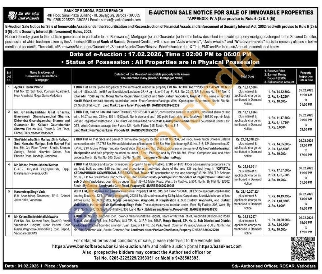 2 BHK Flat, Flat no 316, 3rd Floor, Tower-B, "SHREEJI FLATS", construction area 60.14 sqr mtr, undivided share of land adm. 14.07 sqr.mtr, CS No. 1561, 1562 paiki North side land and 1562 paiki South side land, Total Area 1801.00 sqr.mtr. Moje Vadsar, Registered District and Sub District Vadodara in the name of Mr. Ganshyambhai Sharma and bounded as under East: OTS. West: Common passage then Flat no 321, North: Flat no 315, South: Flat no 317Land Mark: Near Vadsar Lake Property ID: BARB599620250251
