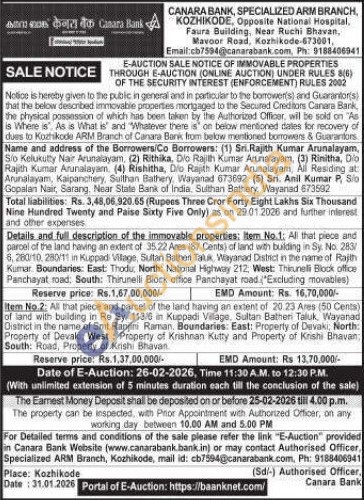 Details and full description of the immovable properties:Item No. 2: All that piece and parcel of the land having an extent of 20.23 Ares (50 Cents) of land with building in Re Sy. 113/6 in Kuppadi Village, Sultan Batheri Taluk, Wayanad District in the name of Smt. Ranjini Raman. Boundaries: East: Property of Devaki, North: Property of Devaki: West: Property of Krishnan Kutty and Property of Krishi Bhavan South: Road, Property of Krishi Bhavan