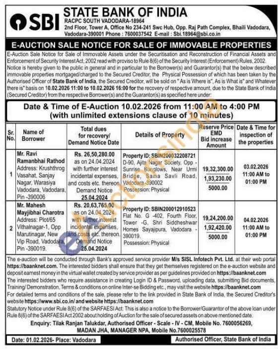 Flat No. G -402, Fourth Floor, Tower G. Shri Siddheshwar Homes Sayajipura, Vadodara Property ID: SBIN200012910523 390019. Possession: Physical