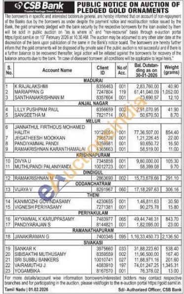 CSB Bank Gold Auctions Auction in Madurai