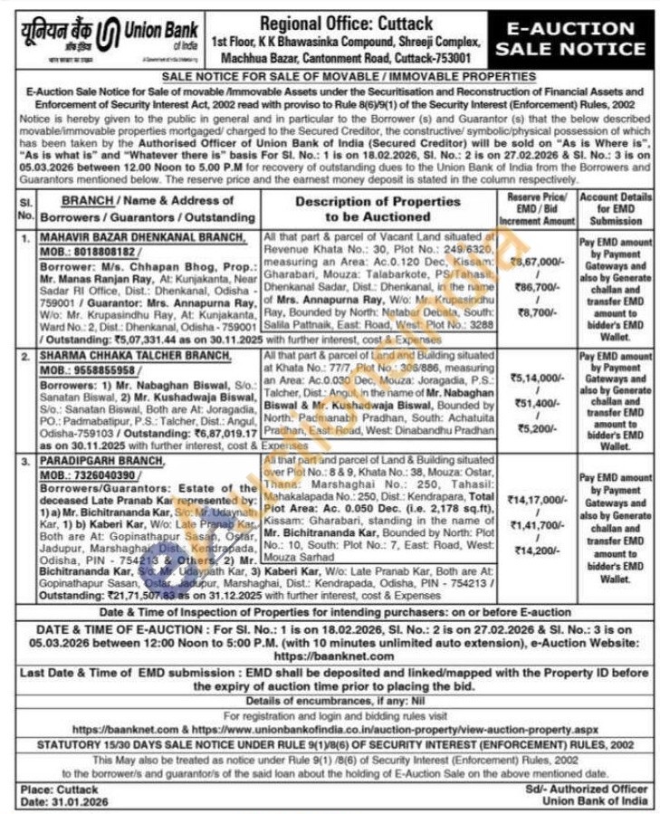 All that part & parcel of Vacant Land situated at Revenue Khata No.: 30, Plot No.: 249/6320, measuring an Area: Ac.0.120 Dec, Kissam: Gharabari, Mouza: Talabarkote, PS/Tahasil - Dhenkanal Sadar, Dist: Dhenkanal, in the name of Mrs. Annapurna Ray, W/o: Mr. Krupasindhu Ray, Bounded by North: Natabar Debata, South: Salila Pattnaik, East: Road, West: Plot No.: 3288 with further interest, cost & Expenses