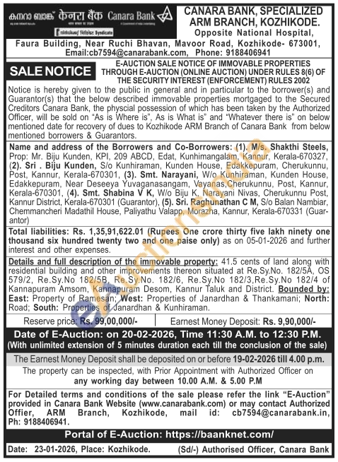 Details and full description of the immovable property: 41.5 cents of land along with residential building and other improvements thereon situated at Re.Sy.No. 182/5A, OS 579/2, Re.Sy. No 182/5B, Re.Sy. No. 182/6, Re.Sy. No 182/3, Re.Sy.No 182/4 of Kannapuram Amsom, Kannapuram Desom, Kannur Taluk and District. Bounded by: East: Property of Ramesan; West: Properties of Janardhan & Thankamani; North: Road; South: Properties of Janardhan & Kunhiraman