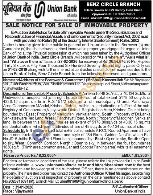 Description of Immovable Property: Schedule A:An extent of 48 Sq. Yds., or 40. 134 Sq.Mts., of Undivided of unspecified joint right house site out of total extent 5178.50 sq.yds or 4330.15 sq.mtrs site in R.S.151/2 situated at chinnaoutpally Grama Panchayat Area, Gannavaram Mandal, Krishna District., within the jurisdication of office of the sub-Registry of Gannavaram, Vijayawada District Registration Area, Krishna District being bounded by: East: Property of Maddineni Venkaiah land, South: Property of Dr. Lanka Venkateswara Rao Land, West: Panchayat Road, North: Property of Maddineni Venkaiah land. In between this four boundaries an extent of 5178.80sq.yds or 4330.15 sq.mts residential site in which joint undivided share of 48 sq.yds or 40.134 sq.mts of site.