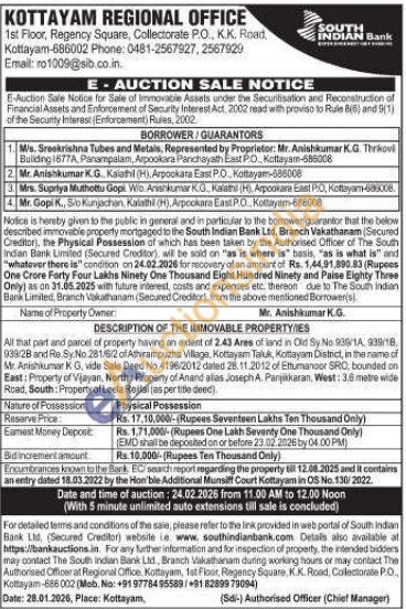 All that part and parcel of property having an extent of 2.43 Ares of land in Old Sy No 930/1A, 939/18, 939:28 and Re Sy No 281/6/2 of Athirampuzha Village, Kottayam Taluk, Kottayam District, in the name of Mr. Anishkumar K. G, vide Sale Deed No. 4196/2012 dated 28.11.2012 of Ettumanoor SRO, bounded an East: Property of Vijayan, North: Property of Anand alias Joseph A. Panjikkaran, West: 3.6 metre wide Road, South: Property of Leela Rejilal (as per title deed)