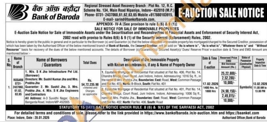 Equitable Mortgage of Residential Flat situated at Fiat No. 401, Plot No. 14, Chandra Bhaga, Court Road, Juni Indore, Indore, Admeasuring: 1006 Sq ft. name of Mrs. Prabha Jha, Boundaries: East: Road, West: Common Passage and Flat No. 402, North: Flat No. 406, South: Road
