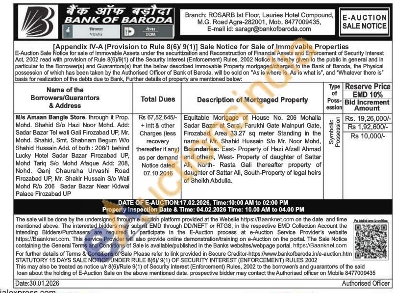 Equitable Mortgage of House No. 206 Mohalla Sadar Bazar at Sarai, Farukhi Gate Mainpuri Gate, Firozabad. Area 33.27 sq meter Standing in the name of Mr. Shahid Hussain S/o Mr. Noor Mohd, Boundaries: East- Property of Hazi Afzall Ahmad and others, West- Property of daughter of Sattar Ali, North- Rasta Gali thereafter property of daughter of Sattar Ali, South-Property of legal heirs of Sheikh Abdulla