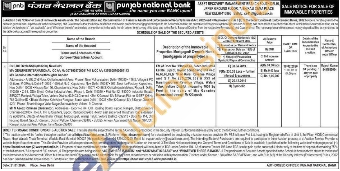 EM of Door No Plot No 42, Sidco Industrail Estate, Sipcot, layout comprising S>F>No: 62,63,68,69, 70 of Karai Revenue Village and S.F No:225,226,352,& 353 of Narsingapuram Revenue Village, Walaja Taluk, Vellore District measuring 7000 Sq Feet in the name of Mis Genuine International through Mr K Ganesh