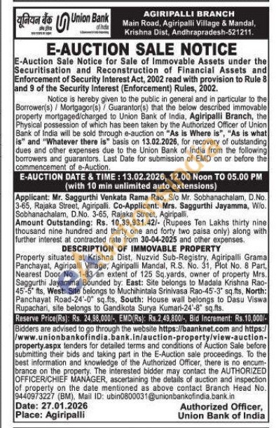 Property situated at Krishna Dist, Nuzvid Sub-Registry, Agiripalli Grama Panchayat, Agiripalli Village, Agiripalli Mandal, R.S. No. 31, Plot No. 8 Part, Nearest Door No. 1-83 an extent of 125 Sq.yards, owner of property Mrs. Saggurthi Jayamma Bounded by: East: Site belongs to Madala Krishna Rao-45-5 fts, West: Site belongs to Muchihintala Srinivasa Rao-45-3" sq.fts, North: Panchayat Road-24-0 sq.fts, South: House wall belongs to Dasu Viswa Rupachari, site belongs to Gandikota Surya Kumari-24'-8" sq.fts.