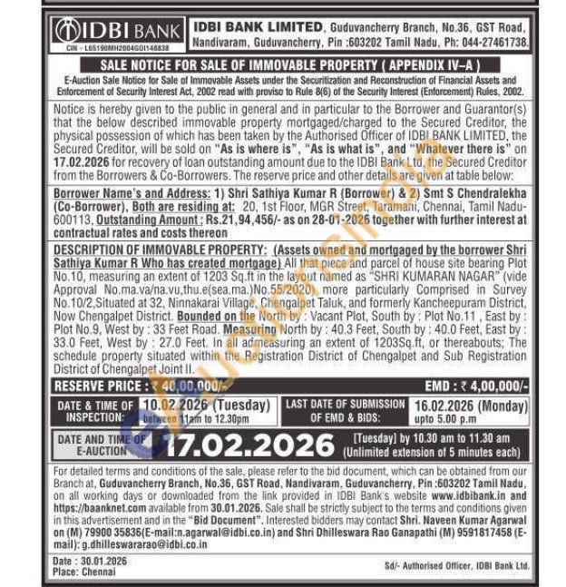 DESCRIPTION OF IMMOVABLE PROPERTY: (Assets owned and mortgaged by the borrower Shri Sathiya Kumar R Who has created mortgage) All that piece and parcel of house site bearing Plot No.10, measuring an extent of 1203 Sq.ft in the layout named as "SHRI KUMARAN NAGAR" (vide Approval No.ma.va/na.vu,thu.e(sea.ma.) No.55/2020) more particularly Comprised in Survey No.10/2, Situated at 32, Ninnakarai Village, Chengalpet Taluk, and formerly Kancheepuram District, Now Chengalpet District. Bounded on the North by: Vacant Plot, South by: Plot No.11, East by: Plot No.9, West by: 33 Feet Road. Measuring North by: 40.3 Feet, South by: 40.0 Feet, East by: 33.0 Feet, West by: 27.0 Feet. In all admeasuring an extent of 1203Sq.ft, or thereabouts; The schedule property situated within the Registration District of Chengalpet and Sub Registration District of Chengalpet Joint II.