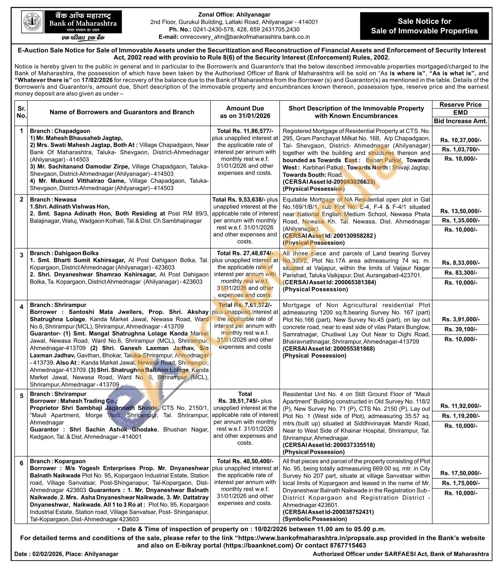 Contact Ph. No.: 0241-2430-578, 428, 659 2431705,2430 E-mail: cmrecovery_ahn@bankofmaharashtra.bank.co.in