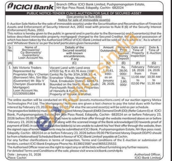 Vacant Land with Land area 47020 Sq. ft in 43.76 Ares (108 Cents) Re Sy No 3/3A,3/38,3/1-4 Eranaloor Village, Muvattupuzha Taluk, Ernakulam District-686673. Bounded on the North: River, South: Panchayath Road, East: Properties of Haneefa & Kuttot, West: Property of Yoyakki & Mathai.