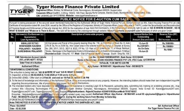 All that pleace and Parcel of the property bearing Shop No. 116, on First Floor of Block No. H. Adm 278.35 Sq. ftsie 25.86 Sq. mirs Carpet area in the scheme known as Sumel -7, Situated at Survey No. 298, 301/1, 301/2, 302/1 & 302/2, F.P No. 121 Paiki of T.P Scheme No. 11, of Mouje Rakhiyal, Taluka - Maninagar in the Registration District of Ahmedabad and Sub District of Ahmedabad-7(Odhav) Bounded as East-Shop No. 117. West-Stair & Passage, North-Passage, South- Shop No. 106.