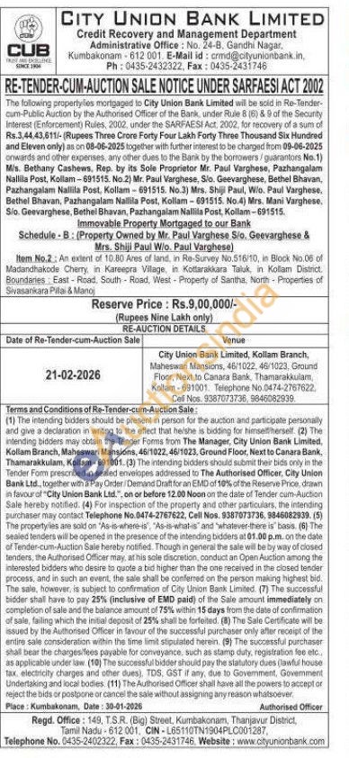 An extent of 10.80 Ares of land, in Re-Survey No.516/10, in Block No.06 of Madandhakode Cherry, in Kareepra Vilage, in Kottarakkara Taluk, in Kollam District Boundaries East-Road, South Road, West-Property of Santha, North - Properties of Sivasankara Pila & Manoj